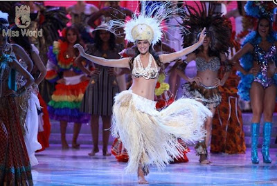 20.01 The Li Dancers start the show with a dazzling colourful dance...Big drums & sticks, a cloud of clapping to the beat as the 60th Miss World kicks off in Sanya style...